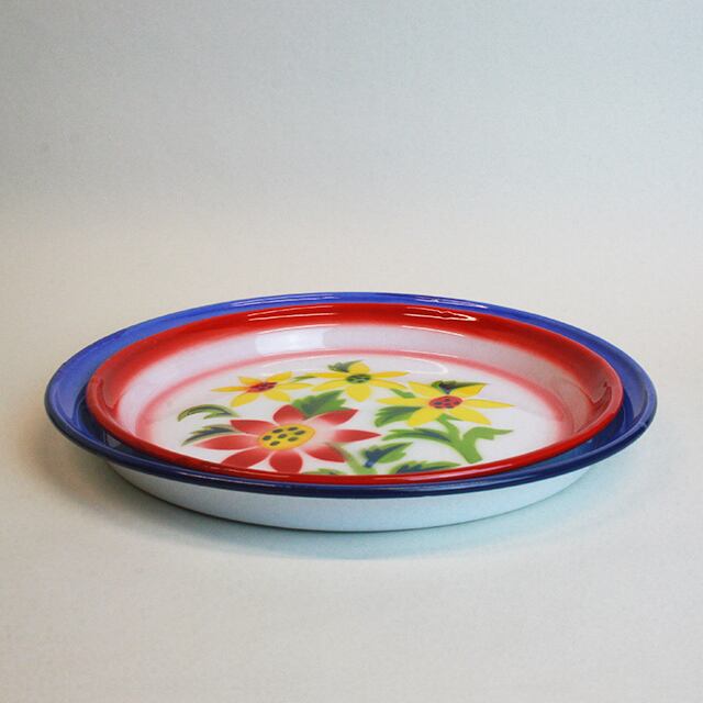 赤い縁取りと花柄が鮮やかなホーロープレートです。