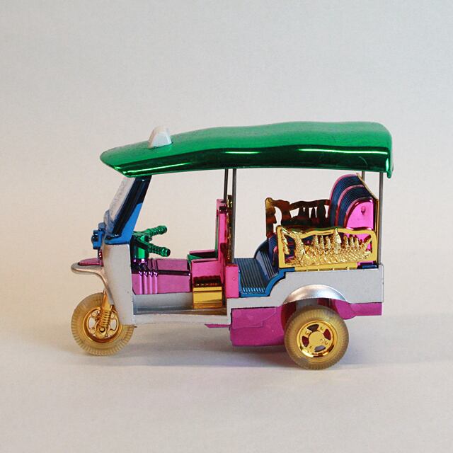 タイのシンボル的三輪タクシー・トゥクトゥクチョロQのビッグサイズです。 ポップなカラーリングと繊細な装飾が美しく、チョロQらしいすばしっこい動きも楽しい一品。お部屋の飾りとしても目を引くこと間違いなしです。 別ページにミニ&小サイズもありますので、そちらもぜひご覧下さい。 サイズ:箱 11cm×15.5cm×6cm、本体 5.5cm×12cm×8.5cm(h) ※箱に若干の凹み・傷等がある場合があります。ご了承下さい。